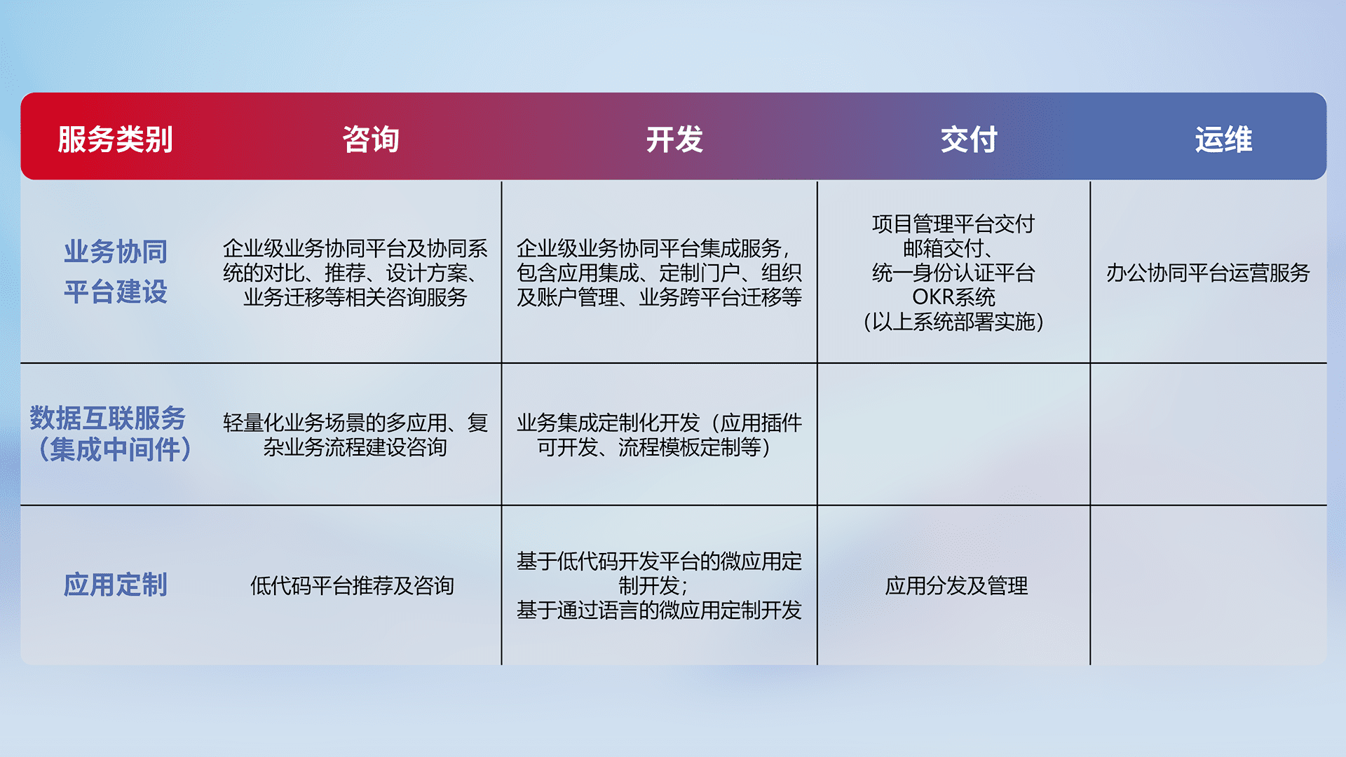 针对钉钉、、、、企微、、IDaas等平台级产品提供产品的规划、、、、方案、、、交付、、定制化开发等服务,,,实现如统一协同办公、、、智能客户服务、、、、混合会议管理、、、智能数据查询、、、等业务场景,,,,实现数字化转型。。